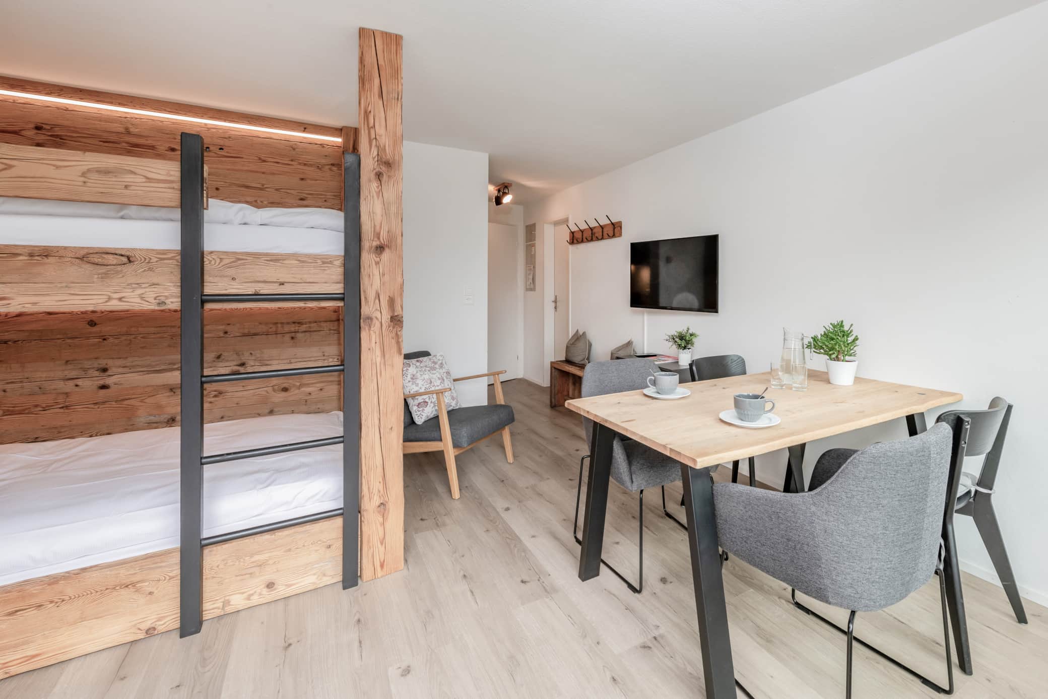 Das Wohnzimmer ist mit einem Hochbett (140 x 200 cm) ausgestattet und bietet Platz für bis zu 4 Personen. Ein Flachbild-TV sorgt für Unterhaltung, während der Laminatboden in der gesamten Wohnung eine moderne und pflegeleichte Atmosphäre schafft. Ein Tisch mit Stühlen bietet zusätzlichen Platz für Mahlzeiten oder Spiele.
